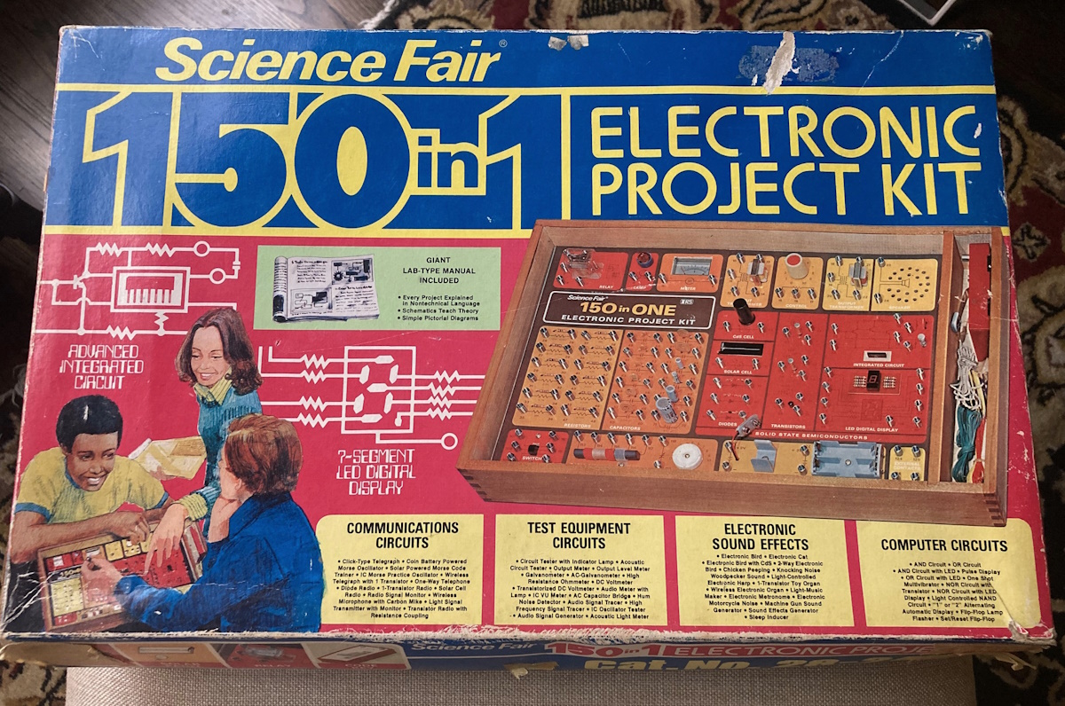 The latter of these columns discussed the spring connectors featured in the hobbyist electronic kits of the 1960s and 1970s. So, you can only imagine my exclamation of “sacré bleu!” when I arrived home yesterday evening to discover a surprise package containing a Science Fair 150-in-1 Kit as shown below.