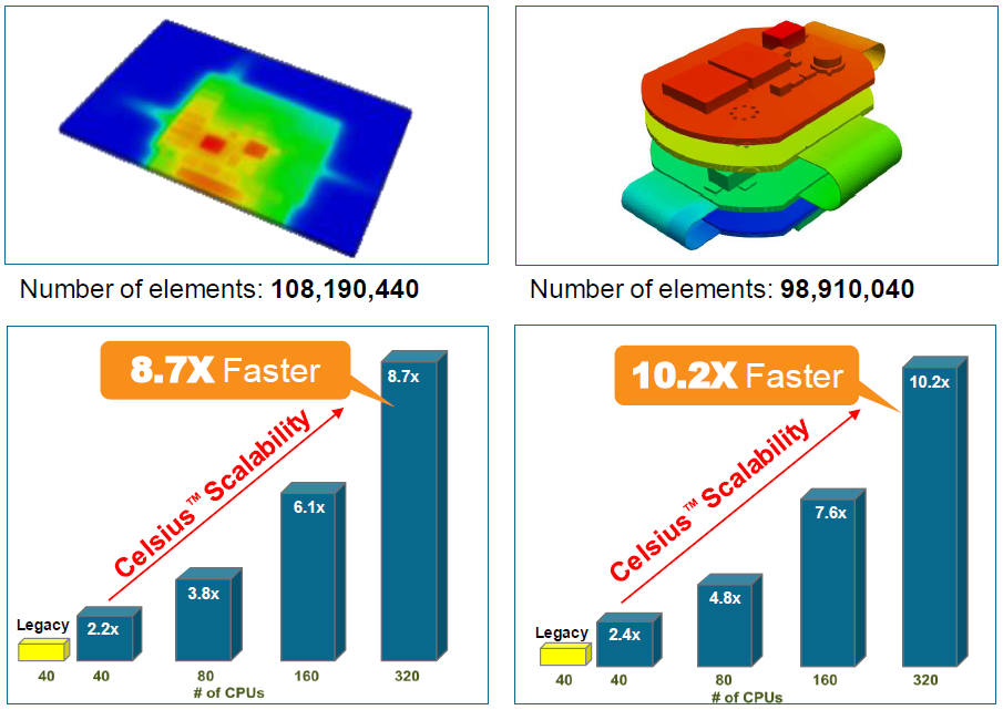 As compared to a legacy tool, Celsius performs better with an equal number of cores and scales such that an 8-fold increase in the number of cores will give roughly a 5X improvement in performance – not bad, considering the limitations of Amdahl’s Law. Improvement over “legacy” is on the order of 10X with 320 cores.