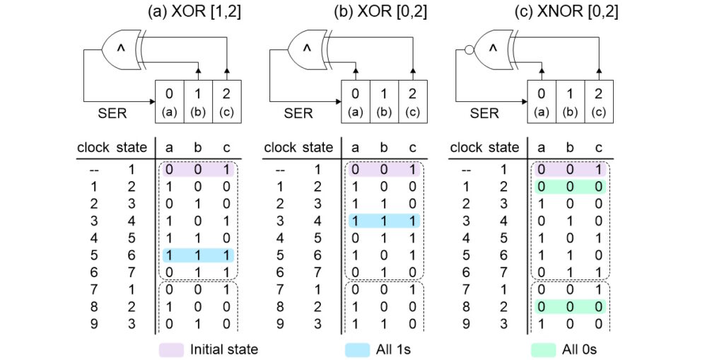 If we select the correct tap points, then an n-bit LFSR will cycle through (2n – 1) patterns. For example, a 3-bit LFSR will cycle through (23 – 1) = 7 patterns. More specifically, a 3-bit XOR-based LFSR will cycle through every pattern except 000, while its NXOR-based counterpart will cycle through every pattern except 111.