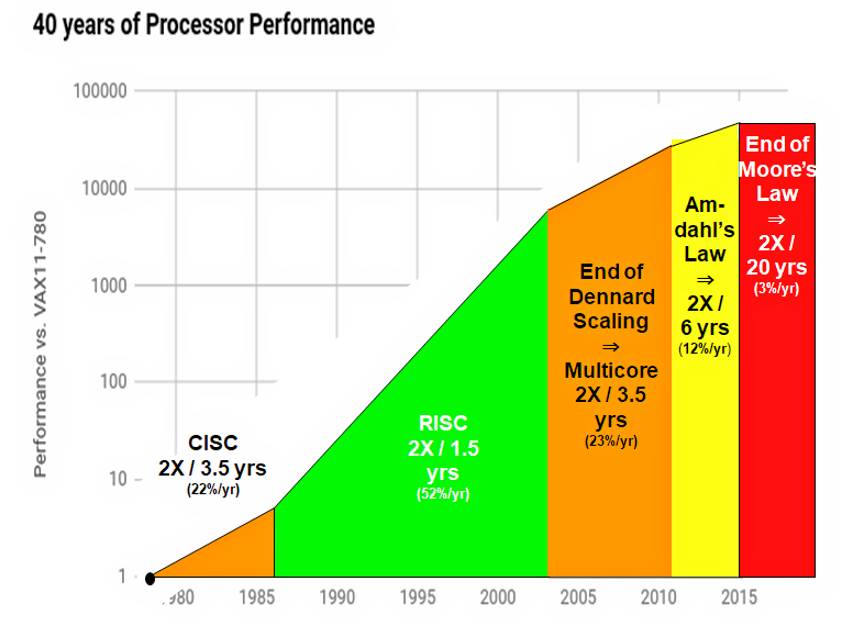 In Tom Stoppard’s play ā€œRosencranz and Guildenstern are Dead,ā€ two insignificant characters plucked from Shakespeare’s ā€œHamletā€ finally discover at the end of the last act that they’ve been dead for the entire play. In the final act of Patterson’s processor history, it’s Dennard Scaling and Moore’s Law that have died. Here’s a figure from the latest edition of Hennessy and Patterson’s book that graphically tells the entire story arc: