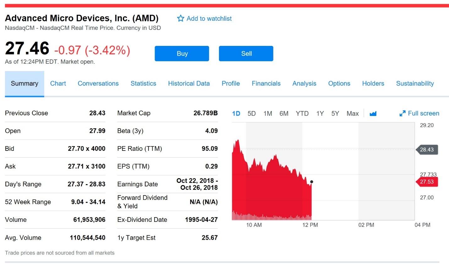 The big red graph, of course, shows the state of play, minute by minute. This is a one-day chart – you can just make out the blue “1D” above the graph – so it represents just the first few hours of trading this morning. This snapshot was taken at 12:24 PM Eastern Time, or 9:24 in the morning AMD time. The chart will slowly grow in real time until it reaches the 4:00 PM mark at the end of the trading day.