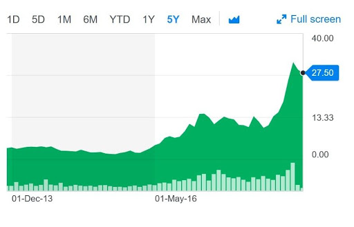 On most financial sites, you can view the company’s share-price changes over longer periods, like a week, a month, a year, or even five years. AMD’s progress over the last five years, below, looks a lot rosier than the one-day snapshot above.