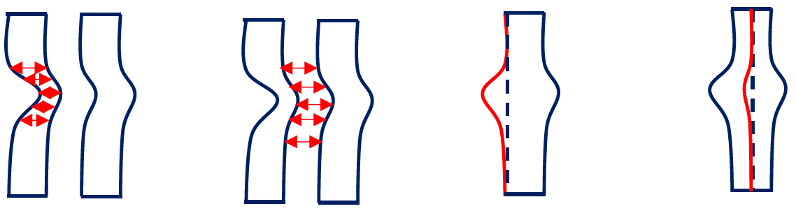 • Line roughness. This has four different variants: roughness in the line edge (LER), line width (LWR), space width (SWR), and pattern placement (PPR). These are illustrated below, showing, from left to right, LWR, SWR, LER, and PPR.