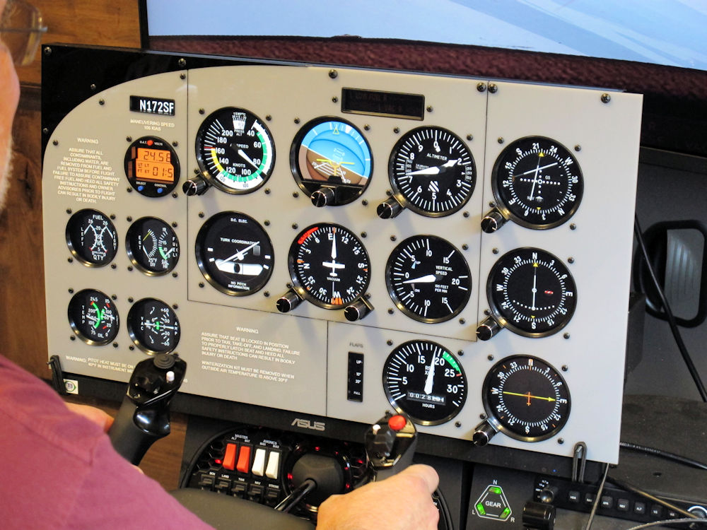 Sartore’s experience led him to conclude that he could develop better flight-simulation instruments at a lower price for simmers, and he’s started a company to produce these products. He’s named this latest venture Altimeter Motives. Sartore’s solution to creating a lower-cost instrument cluster was to paint an acrylic panel to look like the instrument panel from a Cessna 172. This acrylic panel fits over a standard 24-inch flat-screen monitor, with holes cut into the panel to allow you to see the faces of the aircraft’s instrument rendered on the flat-panel screen. Rotary encoders integrated into the acrylic panel provide the controls needed to interact directly with the simulated instruments. It looks very realistic: