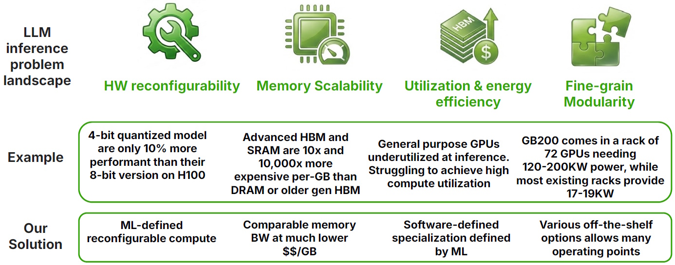 This highlights how today’s LLM inference landscape is being squeezed from multiple directions. First, there’s the issue of hardware reconfigurability (or, more accurately, the lack thereof). Custom silicon at the level of today’s high-end GPUs takes three to five years from architectural definition to deployment. In AI terms, this is “a lifetime” during which the underlying models can change fundamentally.