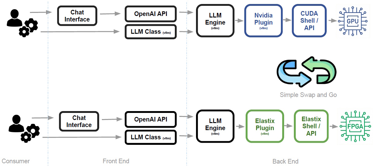 The Elastix solution sits neatly within the existing software stack, supporting familiar interfaces like the OpenAI API and frameworks such as vLLM, but swapping out the underlying NVIDIA/CUDA layer for an Elastix plugin and runtime.