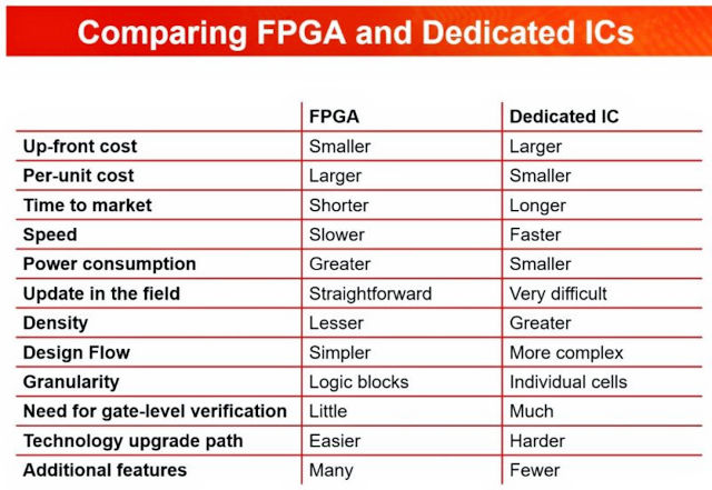 Ates Berna, General Manager and Managing Partner for ElectraIC in Istanbul, Turkey, recently posted a summary comparison chart showing the differences between FPGAs and ASICs on LinkedIn. Although it’s not a detailed chart, I think it’s a great icebreaker that leads to a more detailed discussion about the choices you make between an FPGA and an ASIC when you need a fairly complex high-performance, non-standard IC to solve a design challenge. (Note: The way Berna posted and tagged this chart on LinkedIn, I suspect it may have originated with Doulos, a training organization specializing in FPGA and ASIC design education. The chart compares FPGAs with “dedicated ICs,” which are clearly ASICs in this context.)