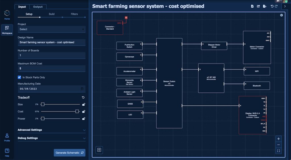 ACE allows an engineer to input their requirements as a functional block diagram, specify their detailed design intent on each block, and, with a single click, generate cost-effective, power efficient, small form factor schematic and BoM options in 60 seconds. It also optimizes for lifecycle status, supply chain resilience, preferred manufacturers, and more.