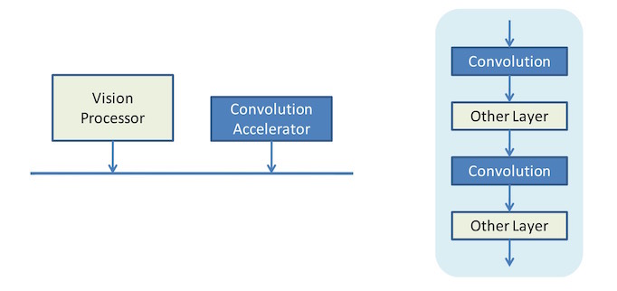 What we’re seeing here is a CNN on the right (highly simplified) as implemented by this older approach. The vision processor in this case hands convolution off to an accelerator attached to the bus, handling all of the other operations itself. This processor could be a DSP or GPU or CPU or some combination of them, at least in theory. The colors on the layers of the CNN on the right indicate which ones are processed by which block.