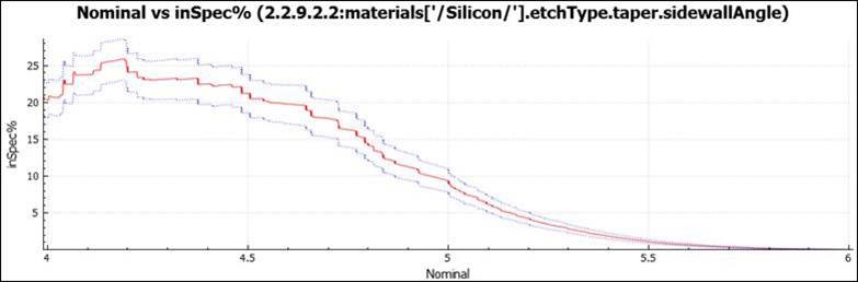 They then calculate an “inSpec%” for various parameter combination windows. One way of viewing the results is through Univariate Parameter Sensitivity, where they sweep one parameter while keeping the others constant to see how the yield varies. This is done with confidence intervals, which are calculated by the tool from the distribution information you provided. An example is shown below, where the red curve indicates the nominal inSpec% value, and the purple lines indicate the confidence interval.