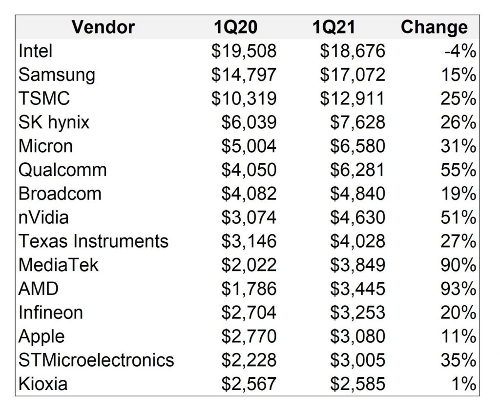 1. […] To quote a famous Scotsman, it’s a great day for America, everybody! The semiconductor industry’s Q1 results are in, and they’re good. Really good. The world’s top chipmakers collectively grew by 21% compared to this time a year ago. That’s a huge increase, especially given how large these companies were already. You try growing a billion-dollar business by twenty percent sometime.  Moreover, eight of the top 15 winners were American. The rest were (predictably) based in South Korea, Taiwan, Japan, or Europe (Germany and Switzerland, sort of) … [Electronic Engineering Journal] […]