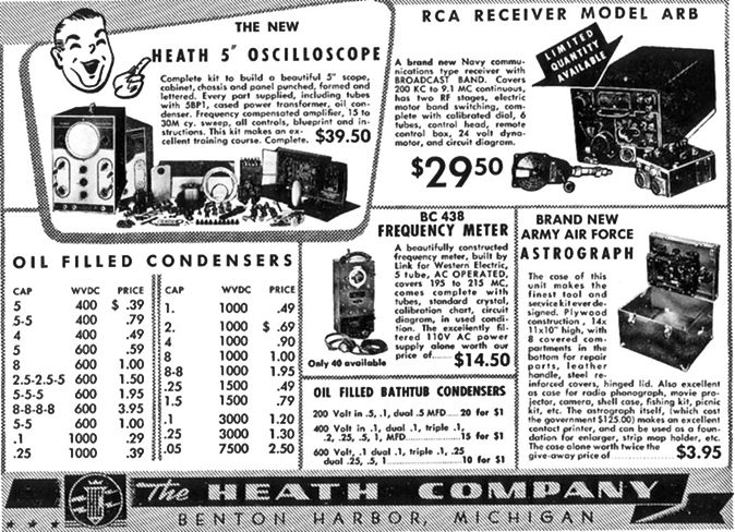 One of the parts that came with this shipment was a very large load of 5BP1 cathode ray tubes. This was a 5-inch tube that you could build an oscilloscope around. And indeed, Howard did just that using a magazine article on how to build an oscilloscope using the 5BP1 CRT that appeared shortly after the war as his reference design. Late In 1947, Heath introduced a kit oscilloscope, model number O-1, selling for $39.50. The O-1 had a whopping bandwidth of 50 KHz. You can see the O-1 oscilloscope and a large collection of military surplus electronics for sale in the advertisement below.