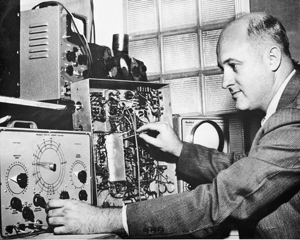 Howard Anthony working with several early Heathkits. Image credit: Chas Gilmore, Chuck Penson, and Terry Perdue