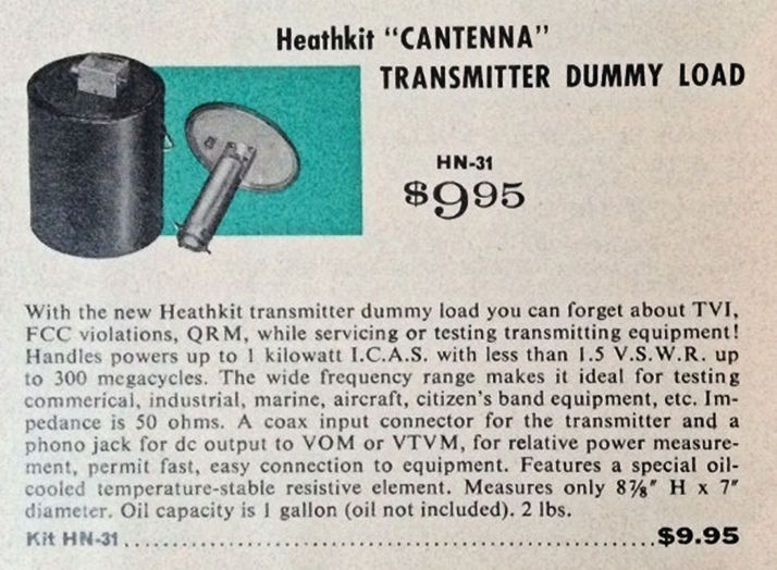 The Cantenna started out at $9.95 for a dummy load with pretty good specifications. Less than 1.5:1 VSWR, all the way up to 300 MHz. It was packaged in a 1-gallon paint can, and the instructions said, “Go down to your local power company and talk to the switch yard supervisor. More than likely, they’ll let you draw off one gallon of transformer oil to keep your dummy load capable of running a full kilowatt.” Filled with oil, the Cantenna would run a full kilowatt for four or five minutes.