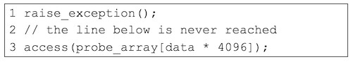 It doesn’t matter what the specific “exception()” is, as long as it causes the processor to stop executing and jump to system-level code, such as an interrupt handler. The point is that the processor will almost certainly start executing the line after it. Even though we know the second line will never be executed under normal circumstances, the processor doesn’t know that and starts executing it speculatively. And because that line references an array, the speculative execution will trigger an external memory access, along with its resulting cache update.