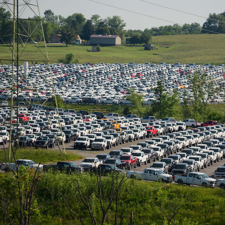 Consequently, car and truck makers are stockpiling mostly finished vehicles wherever they can find space. For example, Ford reportedly started stockpiling partially finished F-150 pickup trucks in parking lots near the Detroit airport, at a Department of Public Works rail yard near Detroit, and in a 30-acre parking lot at the Kentucky Speedway east of Carrollton, Kentucky. (I grew up in Louisville and I’ve been to the Ford Assembly Plant outside of the city.)