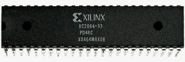 A press release dated November 1, 1985 announced the Xilinx XC2064, the world’s first “Logic Cell Array.” That was the FPGA’s original classification, but the device was destined to be called an FPGA. Here’s a photo of the Xilinx XC2064, packaged in a 40-pin DIP: