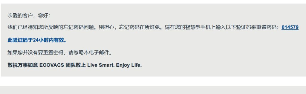 I then linked Amazon Alexa to the Deebot app, mostly because I could. In the process, I had to submit a security code that Ecovacs sent to me by email to confirm my identity. Here’s the email that Ecovacs sent to me: