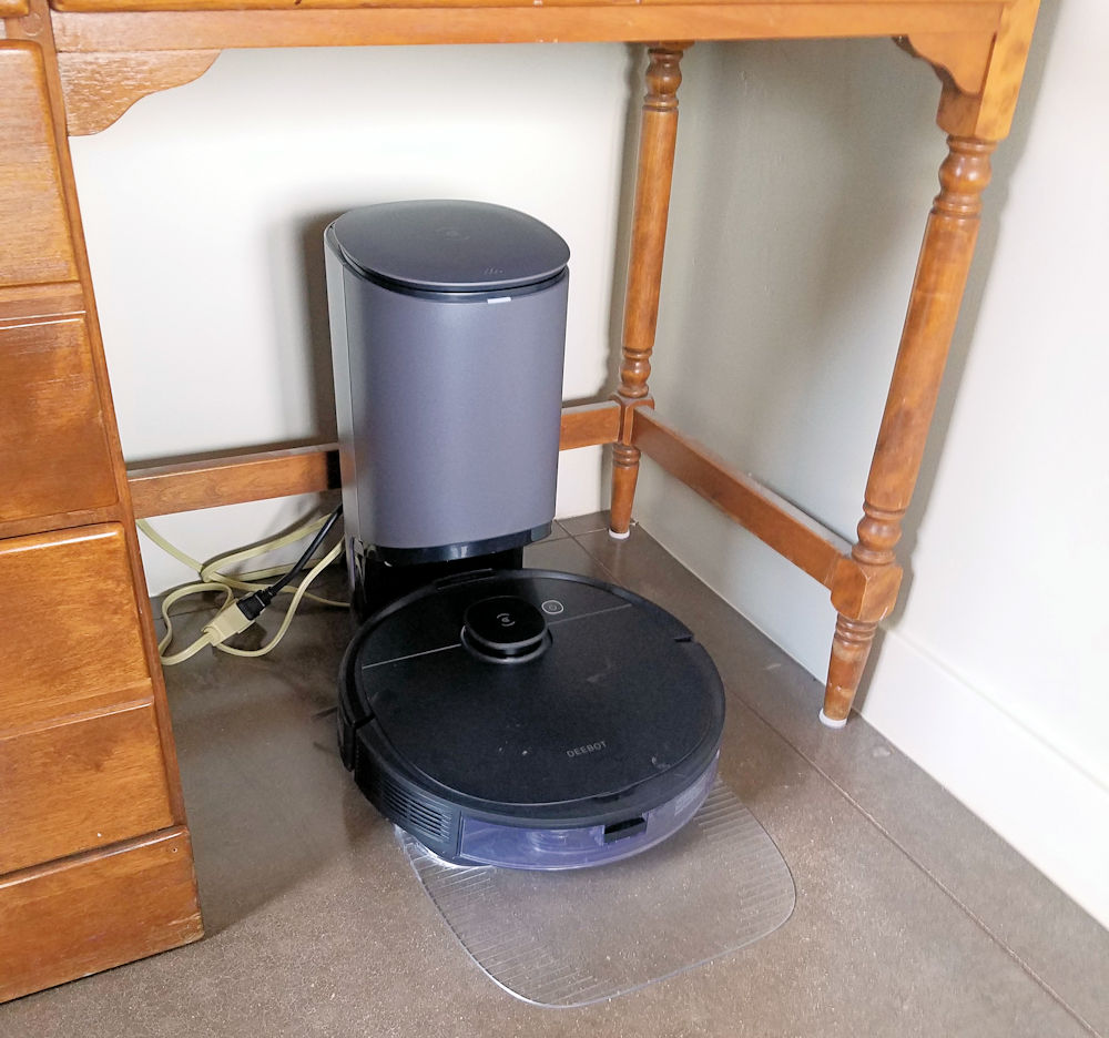 I was afraid Rosie would not find this new location easily, because it’s somewhat narrower than the meter-wide zone recommended by Ecovacs, but there was no need for concern. Rosie easily found the pedestal and docked for a 4-hour recharge. I marvel at the precision and resolution of Rosie’s navigation and mapping technology, not to mention the precise motion made possible by a couple of rubber drive wheels powered by what I suspect are stepper motors.