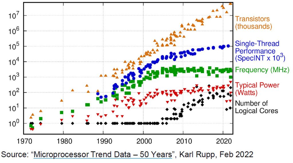 The orange triangles in Figure 1 show the exponential rise in SoC transistor count in line with the original Moore’s Law prediction from 1965. It’s amazing how consistent this increase has been decade after decade. However, the blue circles and green squares tell a different story. This data, depicting single-thread processor performance and clock frequency graphically depict the death of Dennard scaling. The red triangles show a leveling off of power consumption at around 100 to 200 watts. That’s more a function of the maximum thermal dissipation of the device package.