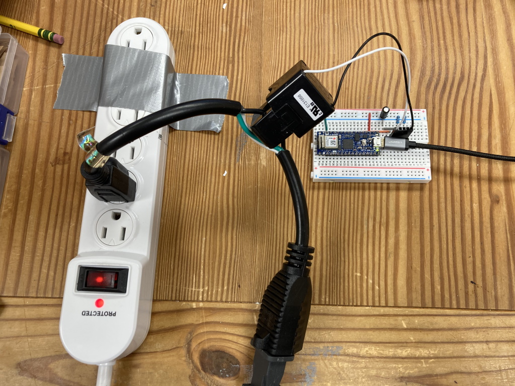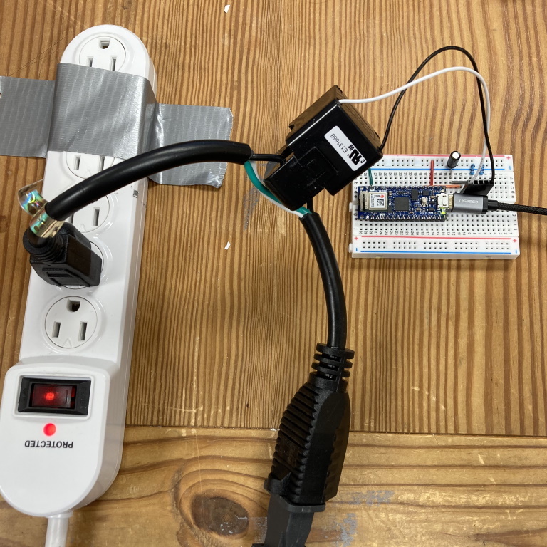 The next step was to build the current sensing circuit that would allow me to use one of the analog inputs on my Arduino Nano 33 IoT to read the value from the CR3111-3000 split-core current transformer. This circuit is shown below.