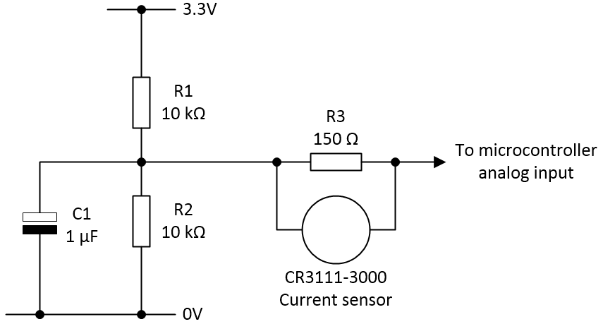 Resistors R1 and R2 act as a potential divider, forming a “virtual ground” with a value of 1.65 V. Capacitor C1 forms part of an RC noise filter. And resistor R3 is connected across the CR3111-3000’s secondary (output) coil to perform the role of a burden resistor, which produces an output voltage that is based on the current flowing through the resistor.