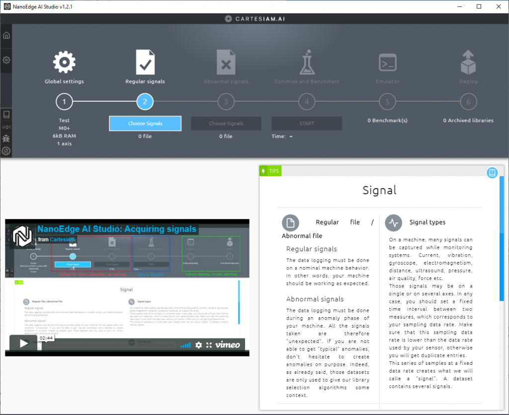 In the previous image, I showed only the upper portion of the NanoEdge AI Studio screen, but there’s much more as we see in the image below. In this case, there’s a video in the bottom left that discusses the process of acquiring signals. There’s also a discussion of the different signal types in the bottom right.