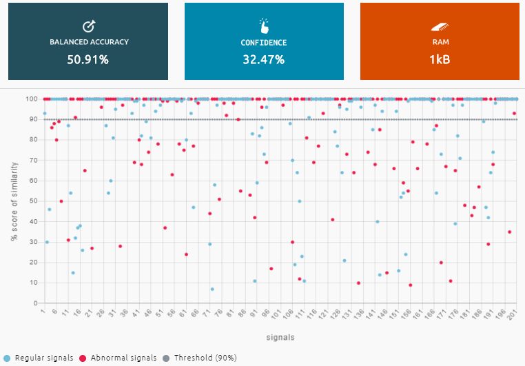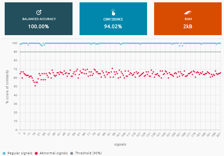Now, armed with our regular signals and our real abnormal signals, we handed things over to NanoEdge AI Studio for optimization and benchmarking. The idea here is that the system experiments with different algorithms, selecting the optimal combination of algorithmic building blocks out of 500 million combinations and permutations, on a mission to achieve the best accuracy with the highest confidence whilst using the least amount of memory.