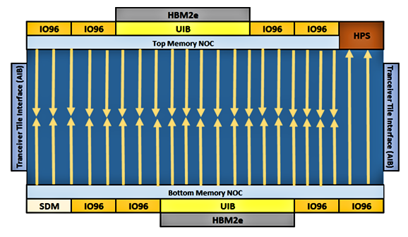 Each vertical network segment extends halfway into the logic fabric, either from the Top or Bottom Memory NoC. These vertical NoC segments connect to the M20K blocks embedded in the FPGA’s programmable logic fabric, and they only convey data one way, from the HBM2e and DDR memories to the M20K blocks. Data written to the HBM2e and DDR memories from the fabric and the read/write control logic implemented in the fabric must go to the HBM2e and DDR memories through the logic fabric.