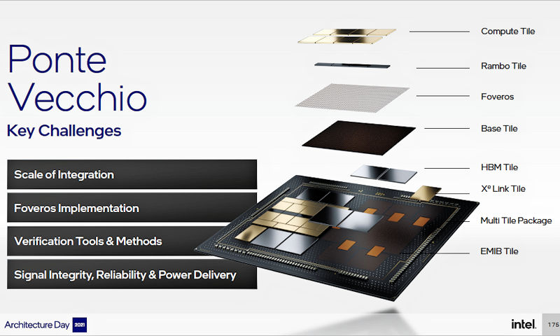 Intel’s Ponte Vecchio GPU combines 47 active “tiles” (dies) manufactured with five different process technologies in one package.