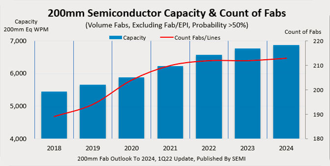 Last year’s report from Semi said that the number of 200mm fabs bottomed out at 180 in 2015, down from the previous peak of 202 fabs. By 2024, we will have a new high-water mark of more than 210 200mm fabs and fab lines, according to the report.