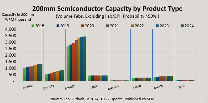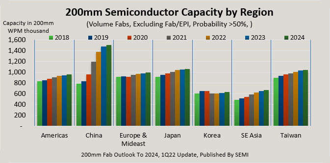 According to this latest Semi report, 200mm fab capacity increased 6% in 2021, is expected to increase by 5% in 2022, and will increase again by another 3% in 2023. The new report projects more moderate growth of about 2% in 2024. Want more details? Well, Semi wouldn’t send me the report because they didn’t want me to give away their store, which I can understand. They want you to buy the report to get the details. However, Semi did send me some interesting graphs from the latest version of the report, so I will discuss those.