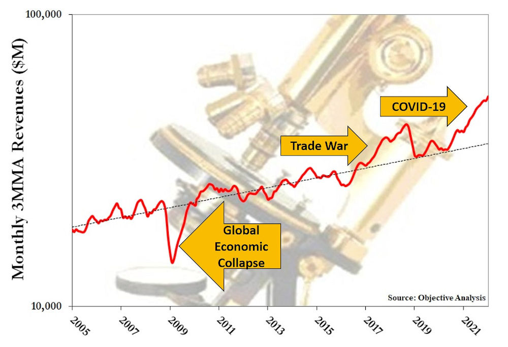 “How is this likely to end? If you have another look at the chart there seems to be every reason to expect for the market to return to its original 3.9% growth level, the black dashed line, at some point. It always does. That won’t be easy, since February revenues were 45% above trend. The shortage and its record revenues will end, though, and when they do revenues are likely to follow the same steep decline that the chart makes so clear in 2019, and that also shows up to a far smaller degree in the six little downturns between 2010 and 2017.”