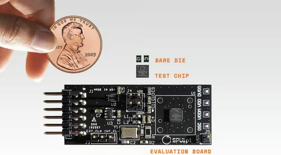 SPU001 bare die, packaged chip, and evaluation board (Source: Femtosense)