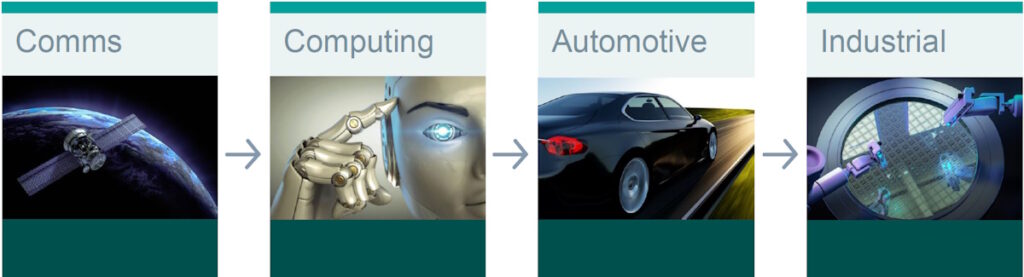 Communication systems were followed by computing. The push for 48V power distribution in data centers by Google and the Open Compute Project (OCP) began gaining significant attention circa 2016.