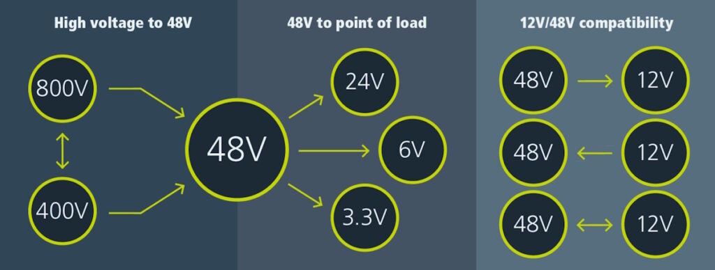 This portfolio can be visualized as being partitioned into three areas. The first (left in the image above) is from high voltage (400V and 800V) to 48V. This is of particular interest in the electric vehicle (EV) automotive arena, where 400V batteries are transitioning to 800V.