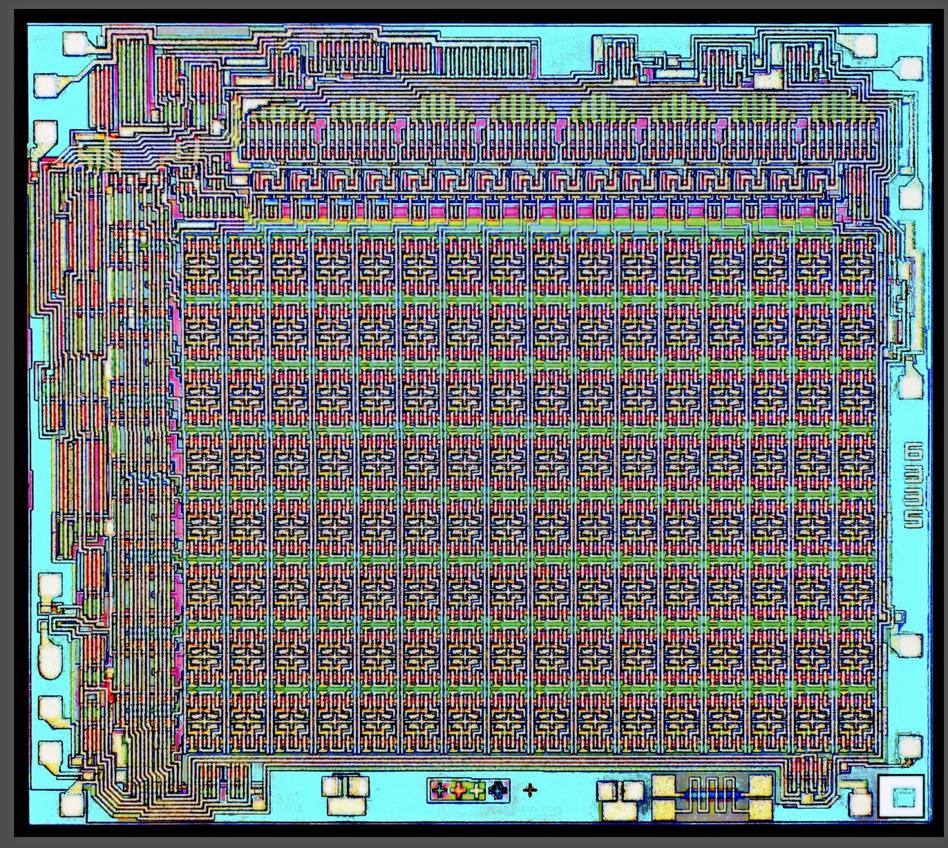 Die shot of the RCA CD4061A 256×1-bit CMOS SRAM, still bearing the development number “6335” along the right-hand side. Image credit: Steve Emery, ChipScapes.com