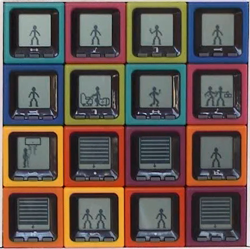 Each of the original Cube World cubes contains an animated stick figure who performs various actions. The figures can interact (including moving between cubes) when multiple cubes are connected horizontally and/or vertically, as in the 4×4 world depicted below.