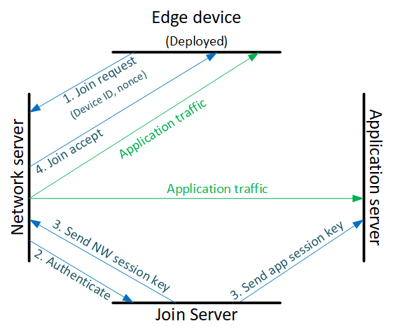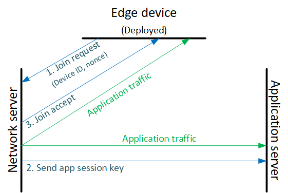 The next important point is that the edge device never talks directly to the application server. Everything goes through the network server. So, per the 1.0 version of all of this, the edge device requests to “join” the network and the application by sending the request to the network server, which generates the application session key and sends it to the application server. It then sends a “join accept” message back to the edge device. This is illustrated in the following figure.