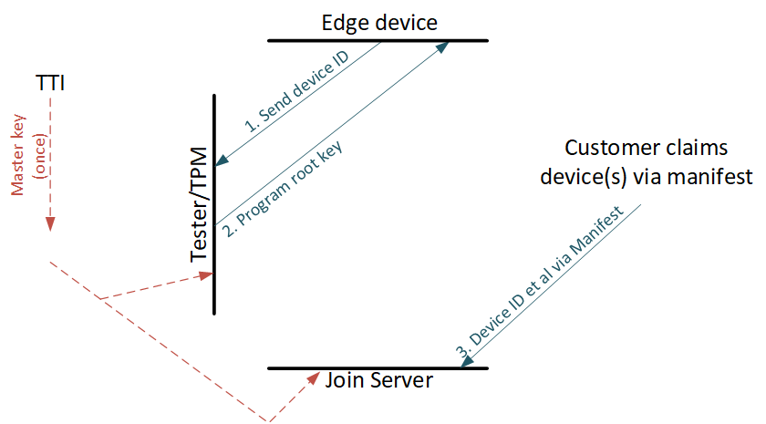 What’s changed now is that a join server has been added to the network. This join server is provided as a service by TTI. TTI has shared two master root keys with Microchip; one of them is for provisioning. Both the tester or trusted platform module (TPM) and the join server use this master key with a device ID to create device root keys. The join server gets the IDs from a “manifest” that the customer downloads from Microchip and then sends to TTI.