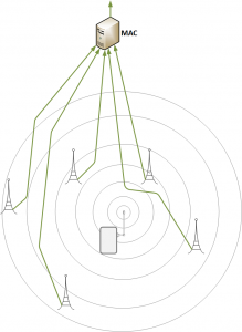 But LoRaWAN doesn’t work this way. You don’t get assigned to a specific tower; when your equipment transmits data (so-called up-link, since you’re sending up away from the equipment), you multi-cast to any towers in range. The server at the top of this arrangement receives all the signals from all the towers that saw the data and then de-duplicates to isolate the single packet. Simply put, the server is handling the MAC functions for the connection.
