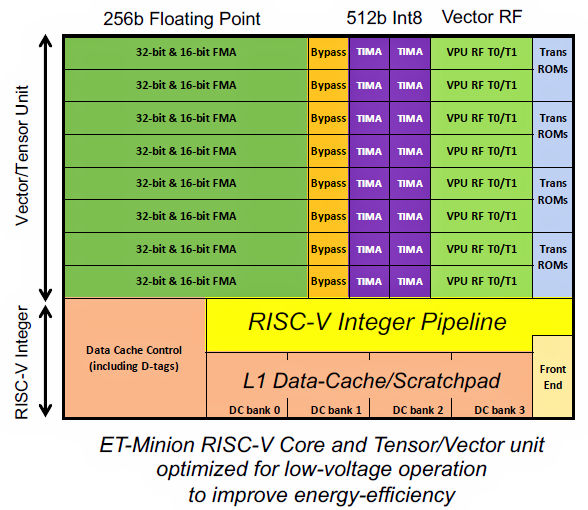 Fig 1 illustrates the layout of an ET Minion core. As Fig 1 shows, the vector/tensor unit dwarfs its attached 64-bit RISC-V integer controller core: