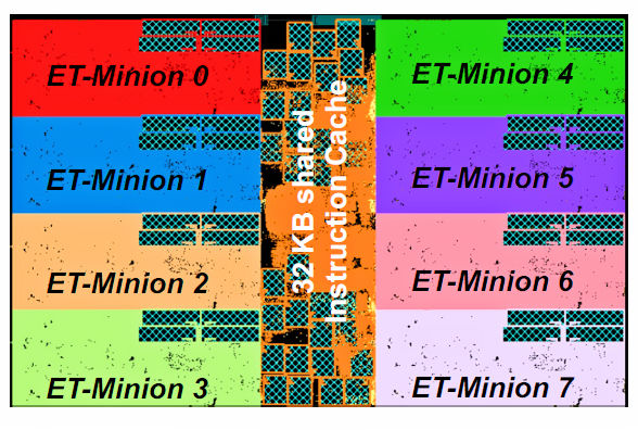 Fig 2: Eight ET Minion processor cores and 32 Kbytes of shared instruction cache RAM comprise an ET-SoC-1 ML inference chip “Neighborhood.”