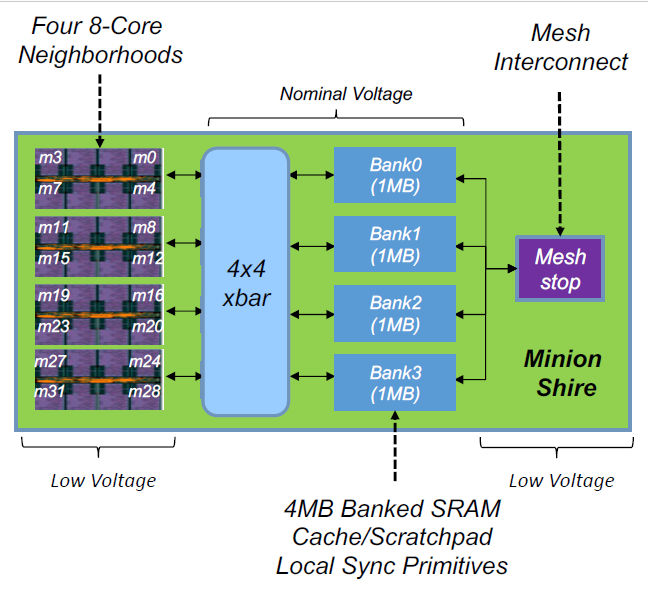 Four 8-core ET-Minion Neighborhoods are then connected to four on-chip, 1Mbyte SRAM banks through a 4×4 crosspoint switch to form a “Minion Shire.” (The Esperanto naming committee must have had a field day with these names.) A Minion Shire block diagram appears in Fig 3.