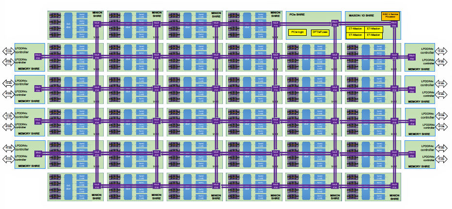 Fig 4: The full ET-SoC-1 ML inference engine consists of 34 Minion Shires, a quad-core ET Maxion processor Shire, eight Memory Shires with LPDDR4 SDRAM controllers, and a PCIe Shire.