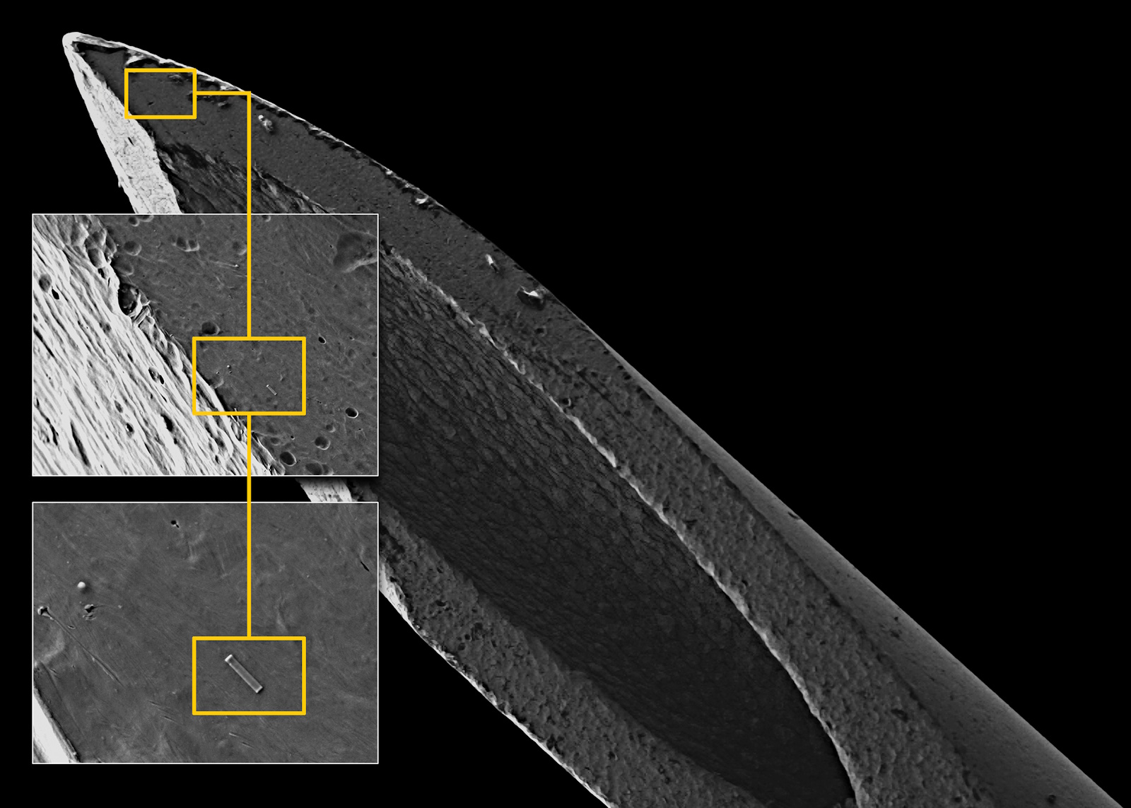 To the naked eye, hypodermic needles are as smooth as mirrors, but things get a little “lumpier” when we zoom in for a close-up view, like the image of the tip of such a needle, as seen below.
