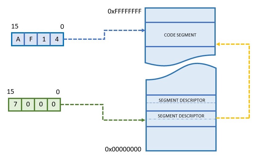You still use two registers to form an address, and one of those registers (the lower part) even works the same as before. But the upper half – called the segment register – is now a pointer into a memory structure. It’s not added to or concatenated with the lower part at all. That’s much too simple. Instead, it’s an index pointer into a huge table where all the details are stored.