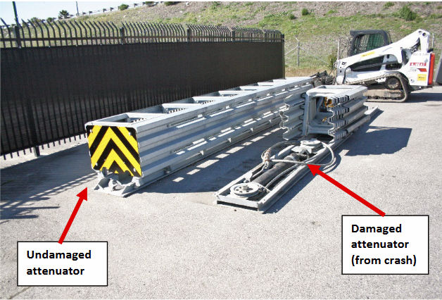 The crash attenuator had been previously damaged eleven days prior to the fatal Tesla crash, suggesting that this is a somewhat dangerous intersection. Here’s a photo of the damaged crash attenuator mentioned in the report alongside an intact specimen. Note how hard it is to distinguish the crash attenuator without the yellow and black end plate:
