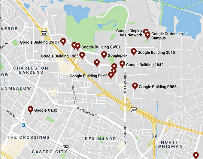 You should know that this intersection is where two major California highways, Highway 85 and US-101, converge and that the Mountain View Googleplex is just north of this intersection. Here’s a map showing the vicinity around the crash site, which is in the lower right portion of the graphic: