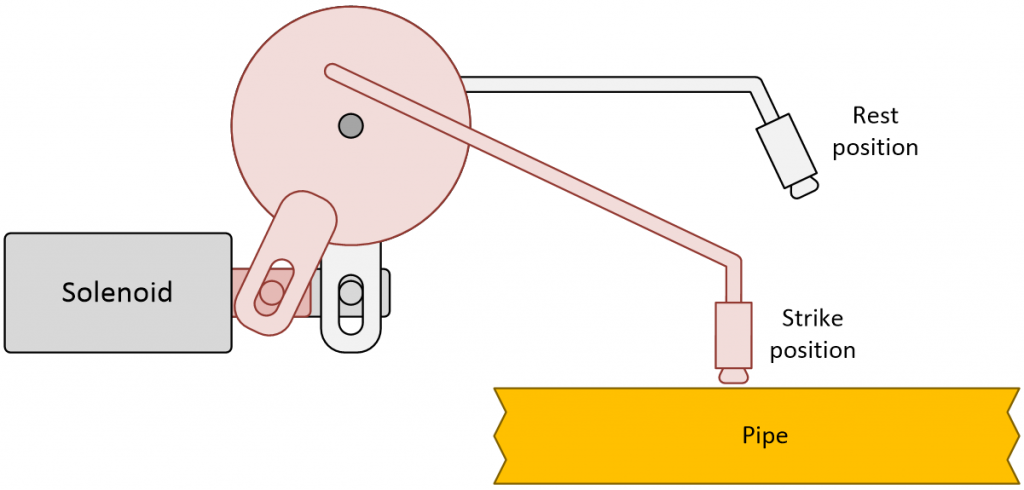Just looking at this video reminded me that I really want to build something like this myself one day, although I was thinking of simplifying things somewhat. For example, Paul used solenoids in which the actuator core protruded from only one end. This caused him to have to create a rather sophisticated striker mechanism to translate the linear motion of the solenoid into rotary motion as illustrated below: